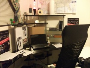 I’ve finally been able to amaze my wife. Angie tends to think I’m an untidy individual who needs ‘training’, so I thought I’d surprise her by showing off my new workspace. Excuse the cardboard at the back, but I intend to replace that tomorrow with a suitably sized piece of something so that I’m not looking at dangling cables every time I look up.